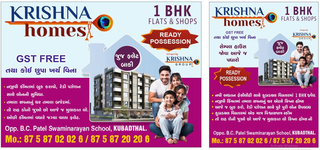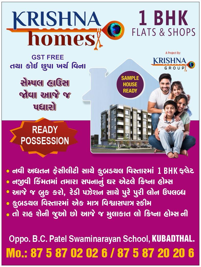 π‘ KRISHNA HOMES β 1 BHK Flats & Shops β¨ Ready Possession Available π₯ GST FREE β No Hidden Charges π Key Highlights: β’ Book at an attractive price with easy home loan assistance β’ Own your dream home within your budget β’ Limited units available β visit today! β’ High appreciation potential at a competitive price π Location: Opp. B.C. Patel Swaminarayan School, Kubadthal π Contact Now: +91 81587 02026 +91 87587 20206 π¨βπ©βπ§βπ¦ A perfect home for your happy family
