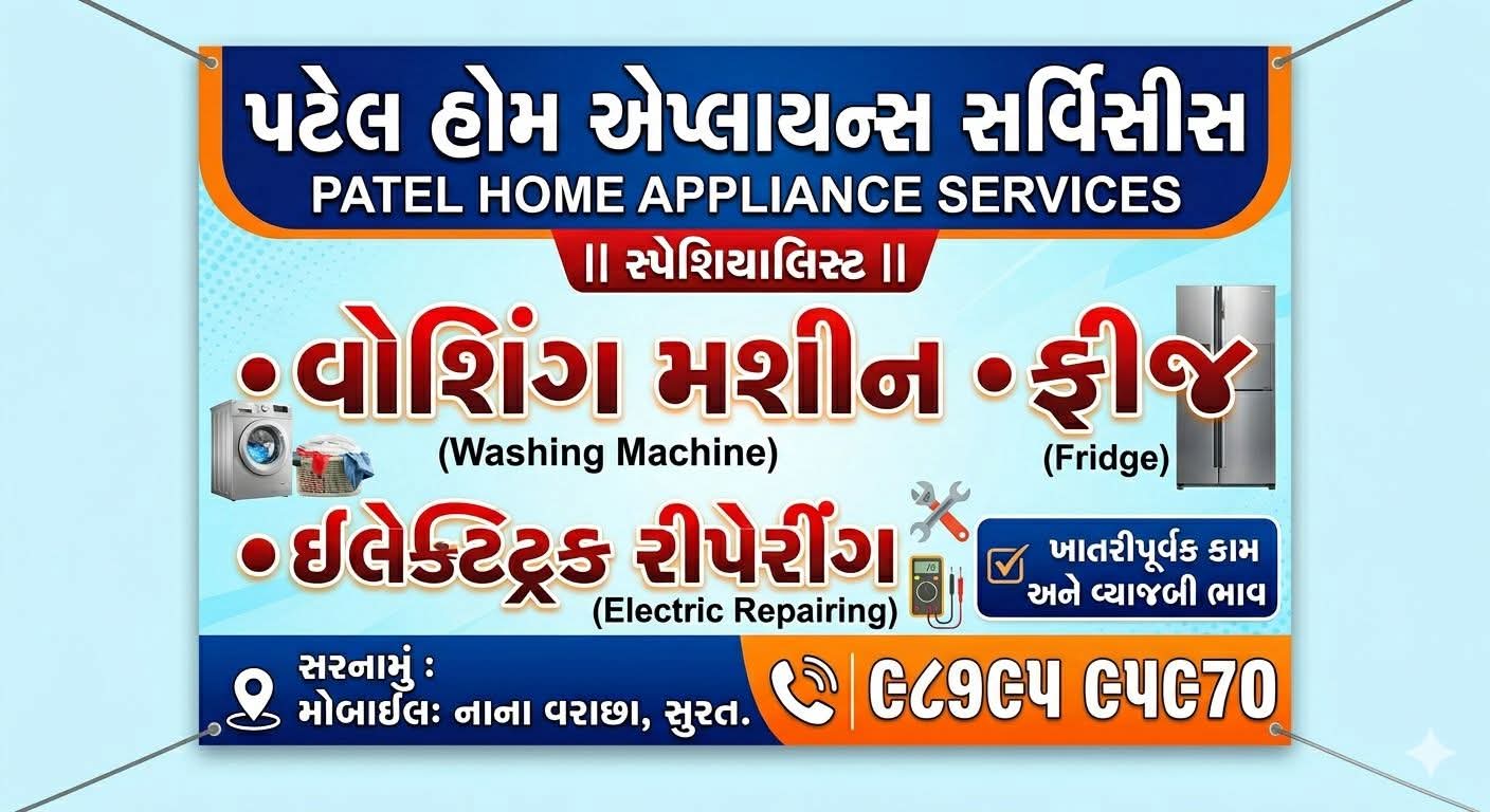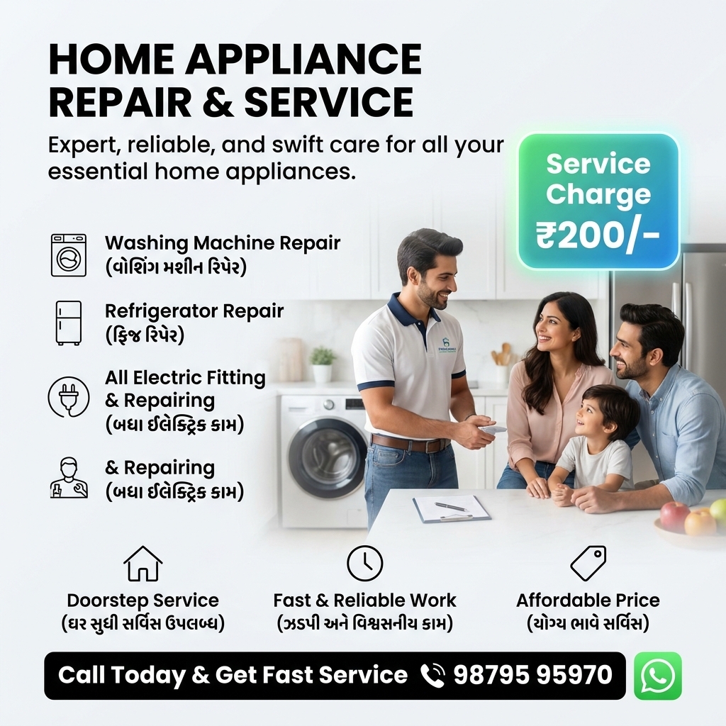 *Expert Home Appliance Repair & Service* Experience expert, reliable, and swift care for all your essential home appliances. We provide professional doorstep solutions to keep your home running smoothly without any hassle. *Our Core Services:* *Washing Machine Repair:* Expert solutions for all major brands and models. *Refrigerator Repair:* Fast cooling and technical repairs at your home. *Electric Fitting & Repairing:* Complete electrical work and maintenance by skilled professionals. *General Maintenance:* Comprehensive servicing for all household appliances. Why Choose Us? *Affordable Pricing:* Transparent service charges starting at just โน200/-. *Doorstep Service:* No need to carry heavy appliances; we come to you. *Fast & Reliable:* We value your time and ensure high-quality, dependable work. *Skilled Technicians:* Professional staff equipped to handle complex repairs efficiently. Call Today & Get Fast Service: ๐ +91 98795 95970